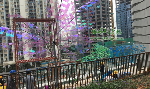 ? 結(jié)合來福士商業(yè)環(huán)境原有的商業(yè)建筑、文化特點(diǎn)及審美需求等因素,深圳來福士廣場(chǎng)開業(yè)美陳外墻部分采用蝴蝶裝飾,選用透明亞克紙裱幻彩膜制作藍(lán)、綠、橙等多彩蝴蝶造型,支架部分為304不銹鋼方通,裝柔性燈帶晚上在燈光照射下絢麗多彩,幻彩蝴蝶造型精美裝飾深圳來福士廣場(chǎng)外墻空間。