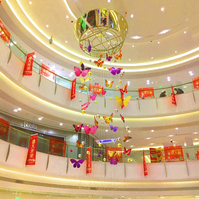 栩栩如生的蝴蝶在商場上空飄舞著,五彩的顏色點綴著商場中庭,仿佛置身于大自然的懷抱中,讓人不禁感嘆春天已經(jīng)來臨。