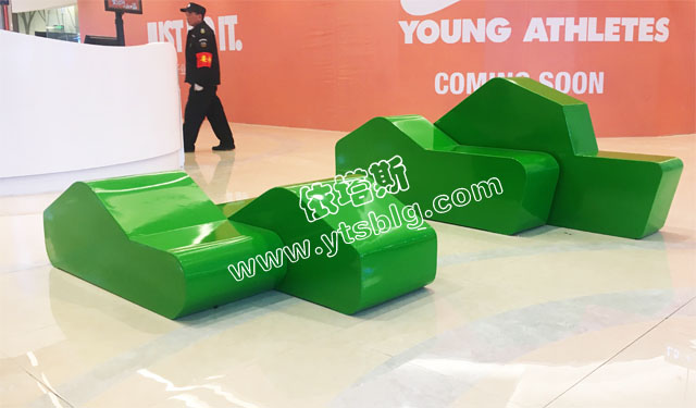 ? ? 大小不一的異形休閑椅組合,其長度依次為2000MM/1500MM/1200MM,采用鮮艷的草綠色噴漆,色澤亮麗,抽象的造型充滿想象的空間,非常適合兒童區(qū)域擺放。