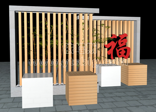 ? ? 整個造型為木質(zhì)結(jié)構(gòu),總長度為3米,為了方便運輸和安裝分兩段來制作,根據(jù)現(xiàn)場情況,總高度為1.8米。底座為了穩(wěn)固木框尺寸設(shè)計為高200,厚度為300,其它外框尺寸為150寬,300的厚度,外刷灰色油漆。中間木條尺寸為30寬*100厚,可均勻受力,外刷淺黃色油漆。木條中間用仿真竹子進(jìn)行裝飾,800*800大小的福字雙面貼在木條上,整體鏤空的設(shè)計形成完美的屏風(fēng)隔斷。隔斷前后擺放450*450*450的白色和仿木紋的玻璃鋼方凳,供顧客休息,這種功能性美陳逐漸被商家追捧。