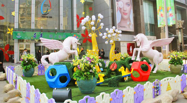 ? ? 由春天的花制成的鐵藝樹,滿滿都是春天的色彩;生動的白馬和可愛的小動物們聚集在樹下嬉鬧。商場的各個角落也都有春色點綴,讓顧客感受身邊的自然氣息。商場門前的綠色主題園藝布展,更富視覺沖擊力,將動物造型與創(chuàng)意花藝相結合,一清早就給人們帶來了足夠的驚喜。許多匆匆的路人都不由驚呼雀躍,競相駐足拍照,以此開啟一天明媚的心情。