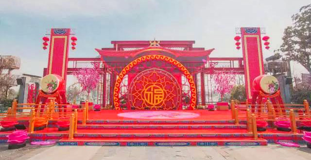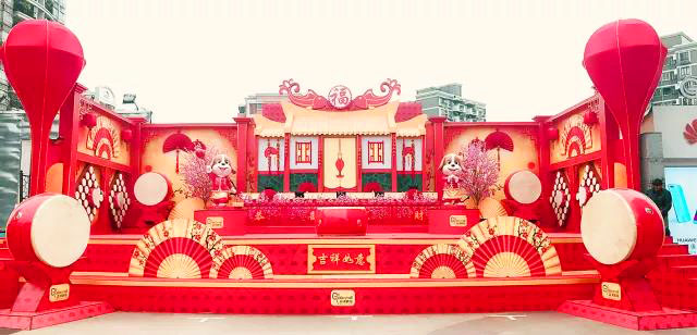 中國紅的主題色浸染著偌大舞臺,古建筑風(fēng)格的門庭設(shè)計(jì),流露出最原味的中國風(fēng)!兩側(cè)燈籠高掛,開門見山式的空間陳列給人以無法言狀的節(jié)日儀式感!