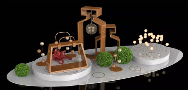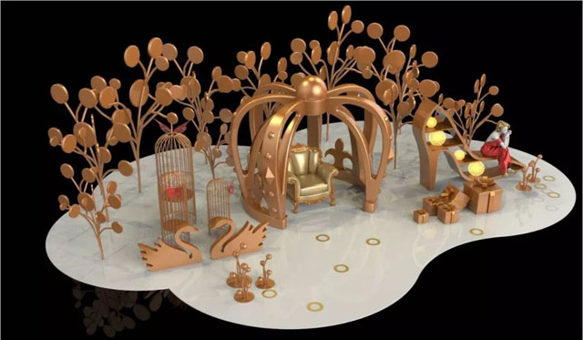 以高貴的鑲金色作為整體主色調(diào),以女性視角展現(xiàn)作品獨(dú)有的視覺張力!皇冠、寶座、高跟鞋、禮品盒,都是女人一生夢(mèng)寐以求的……把這些元素運(yùn)用到美陳作品中可以更大程度提升人們的消費(fèi)欲望,還能整體提升商場(chǎng)的品味和檔次。