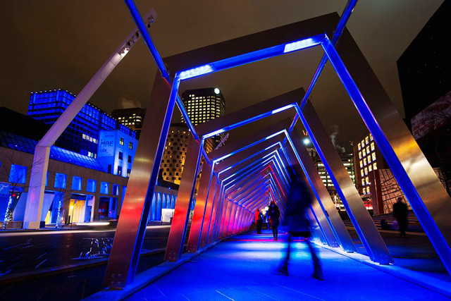 ? ? 1.動靜結合。商業(yè)街把路面照明,街上的公共設施的照明及跨街串燈裝飾組合為一體,從而創(chuàng)造一個有機的照明整體畫面。