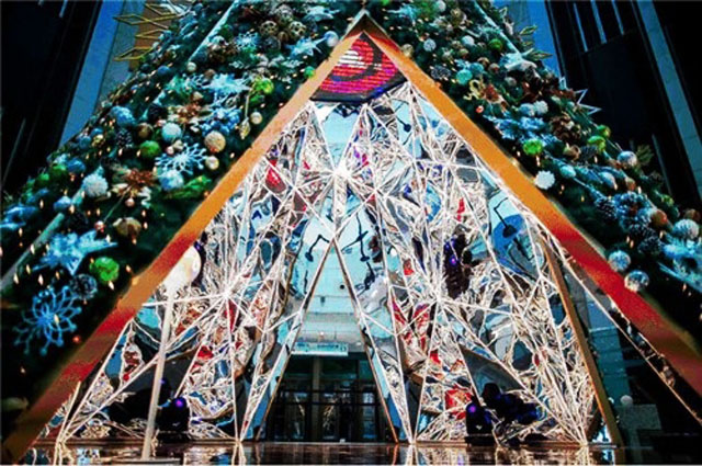 ? ? 更為炫目的是,此次圣誕樹采用的互動(dòng)式設(shè)計(jì)概念,由多塊鏡面裝置組成內(nèi)部結(jié)構(gòu),同時(shí)配合五彩的燈光和頂部的LED屏幕,當(dāng)人們穿梭于圣誕樹的內(nèi)部時(shí),抬頭仰望,即可看到如萬花筒般的神域景象,奇幻絢麗,宛如置身于夢(mèng)幻般的童話世界。
