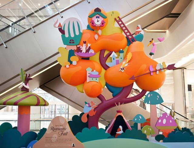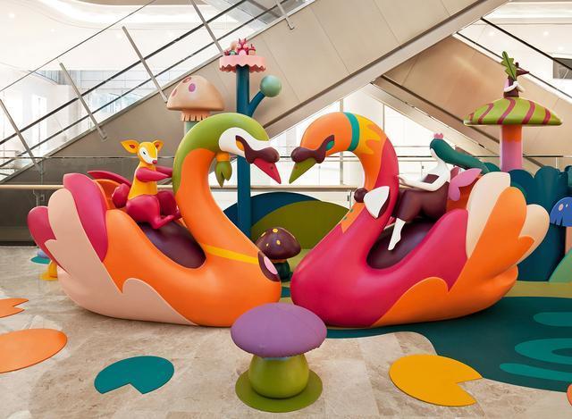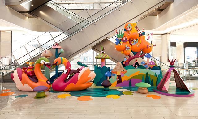 ? 商場美陳設(shè)計方案一:兒童節(jié)商場中庭DP點(diǎn)美陳,地面式DP點(diǎn)造型擺放,橙、紅、綠等多色設(shè)計,1+多組合擺放強(qiáng)化視覺效果,多種材質(zhì)的結(jié)合與主體相關(guān)元素的輔景進(jìn)行整個場景的飽和與修飾,樹、天鵝、蘑菇、城堡等元素營造不一樣的故事情節(jié)。