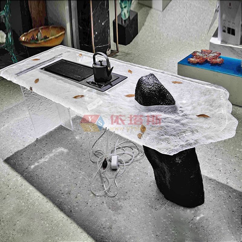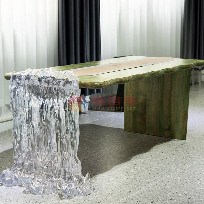? ? ? ? ?觸手所及,表面是經(jīng)過精細打磨的溫潤平滑,全然沒有真冰的刺骨寒意,卻保留了冰的視覺清涼。這種觸感與觀感之間的微妙矛盾,正是其設(shè)計的精妙之處。桌面之下,常常嵌入天然材質(zhì)的基座,或是粗獷沉穩(wěn)的原木,或是冷峻硬朗的黑鐵。木材的溫厚與樹脂的冰透,鋼鐵的堅毅與“冰川”的脆弱美感,在此刻達成了和諧的統(tǒng)一,仿佛冰川悄然生長于凍土與巖層之上,自然之力與現(xiàn)代工藝渾然天成。